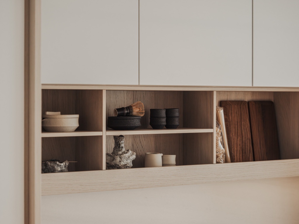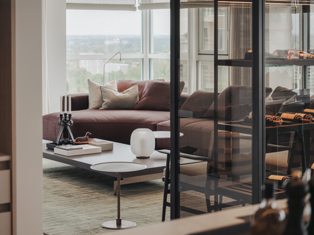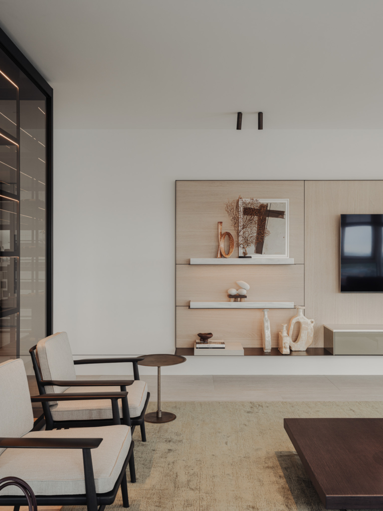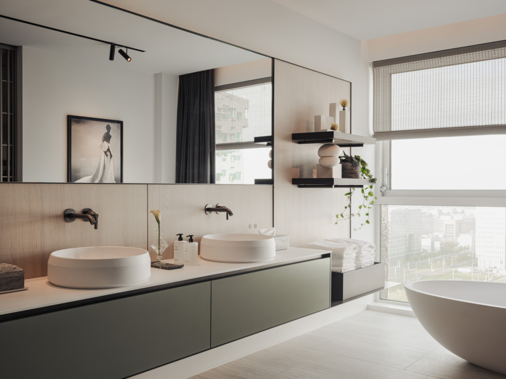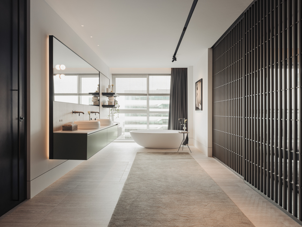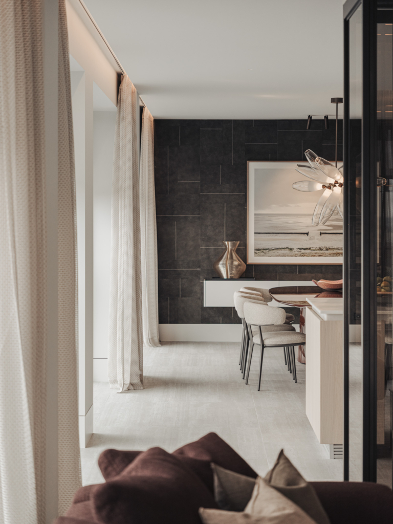 A light base has been chosen throughout the apartment, complemented by warm earthy tones. Refined Italian design is combined with subtle Japanese elements. This layering emphasises the international character and creates a harmonious, elegant atmosphere.