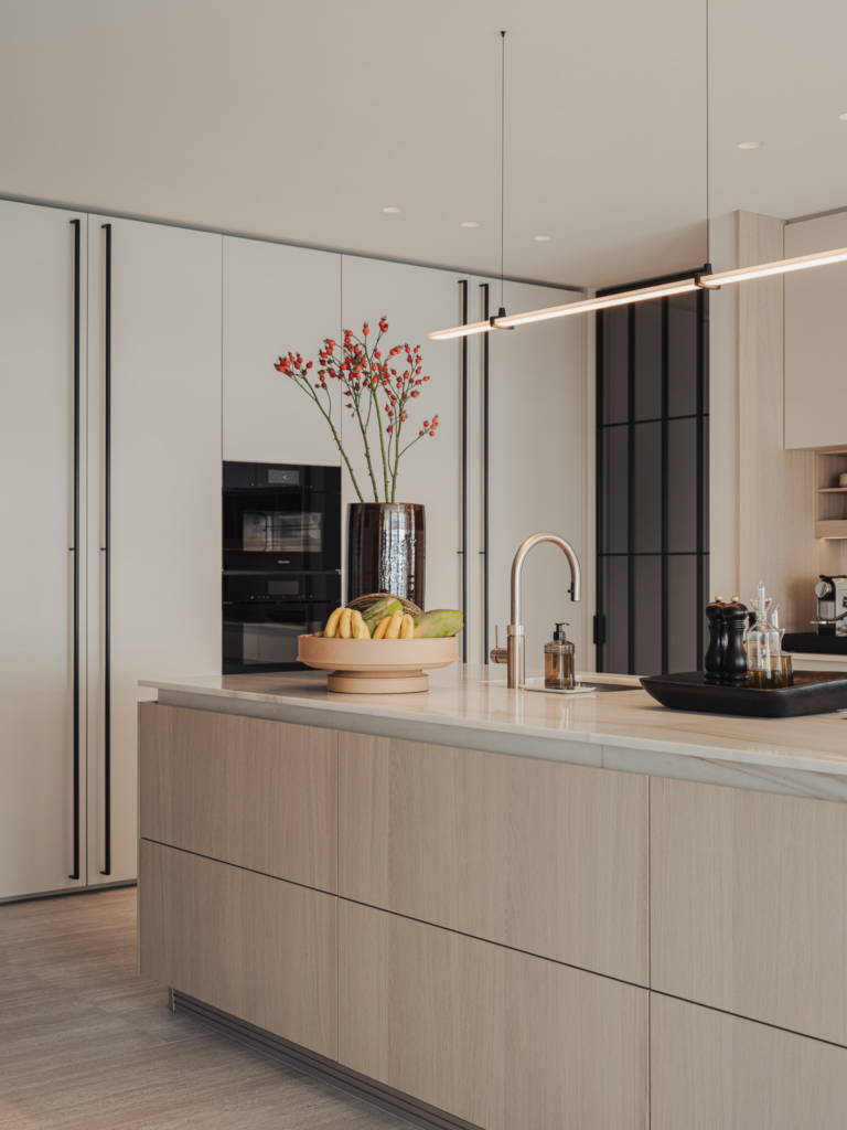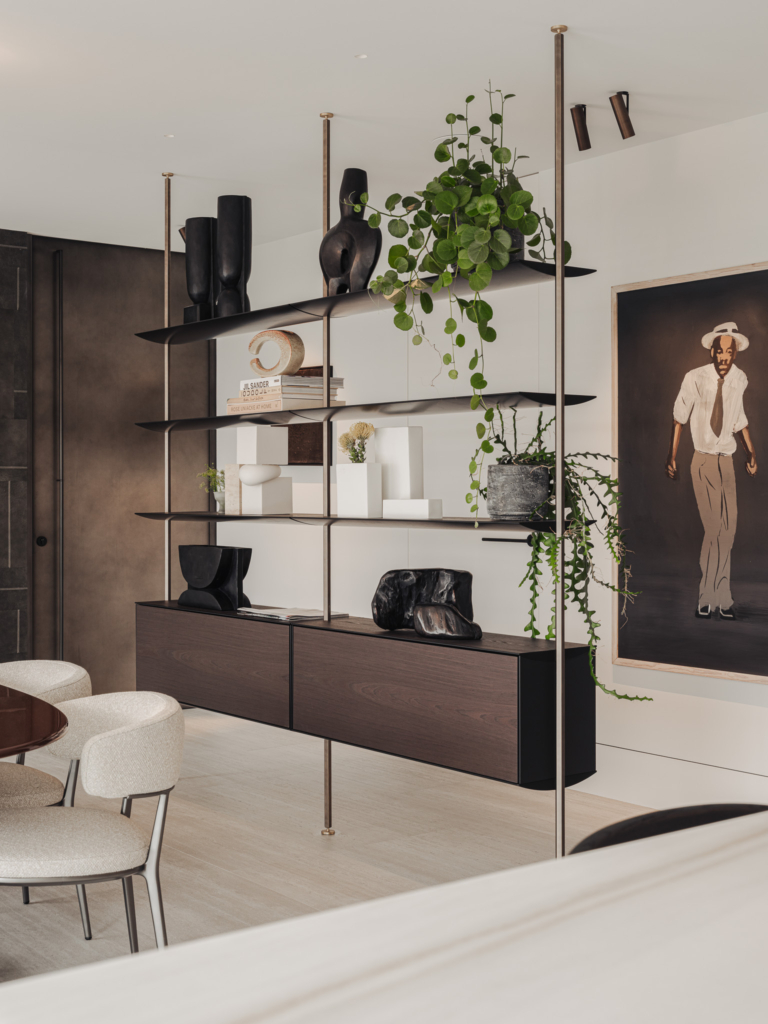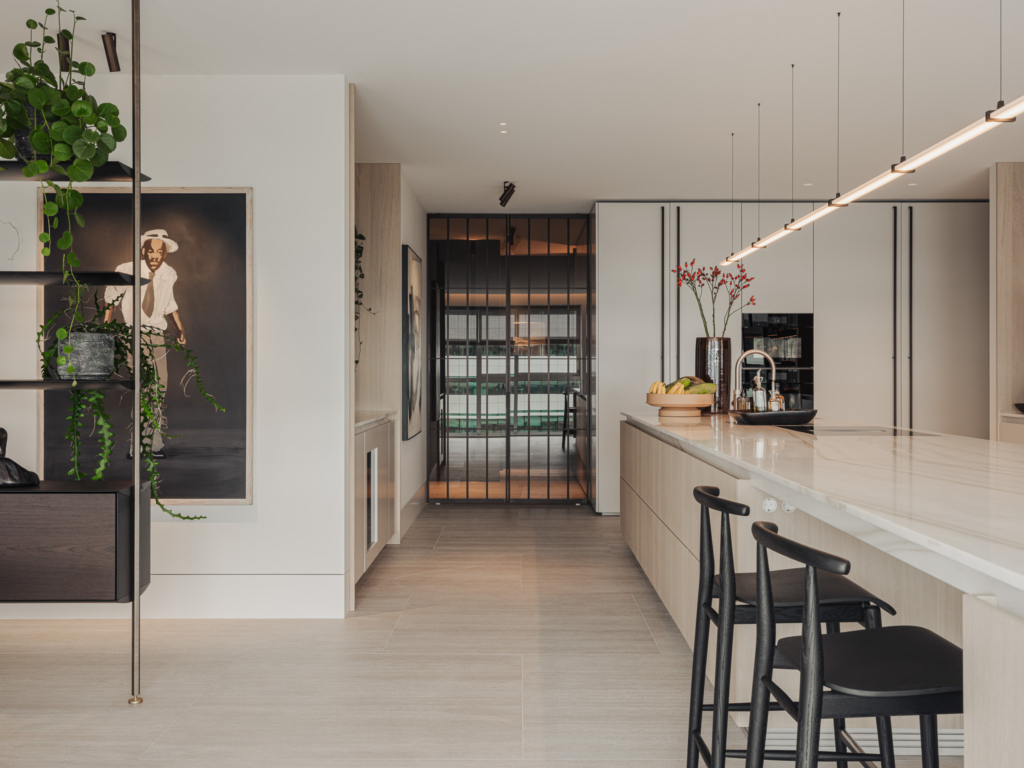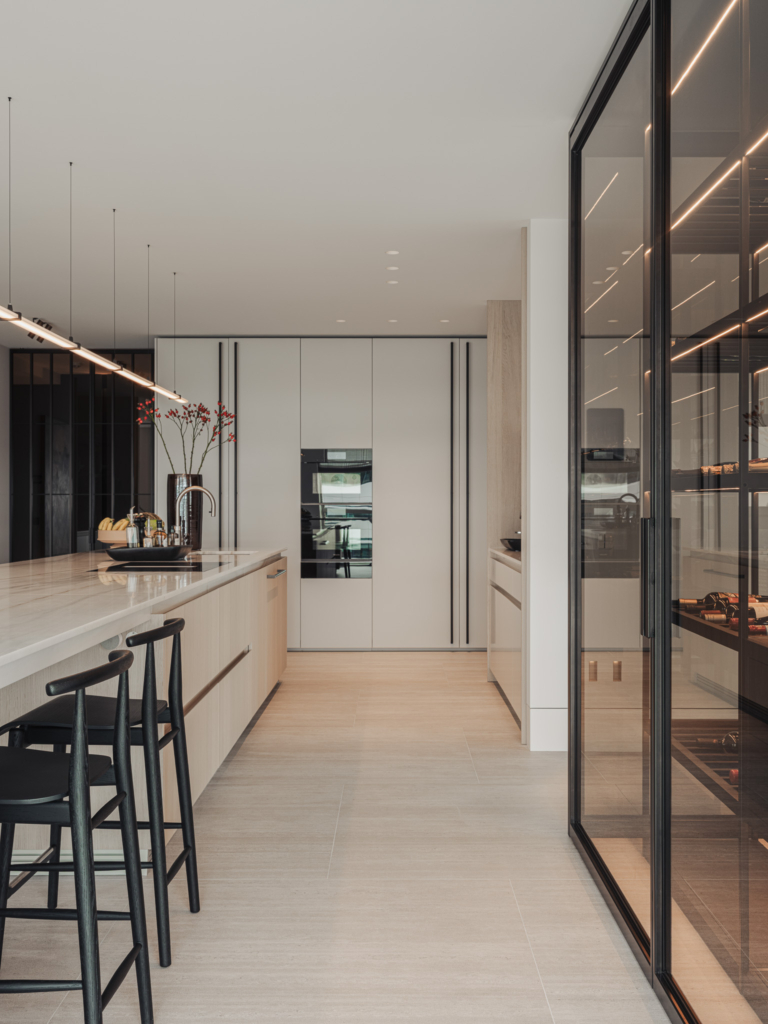 The six-metre-long kitchen island is the unmistakable centrepiece. It is not only a grand gesture, but also a powerful statement that defines the atmosphere and identity of the space.