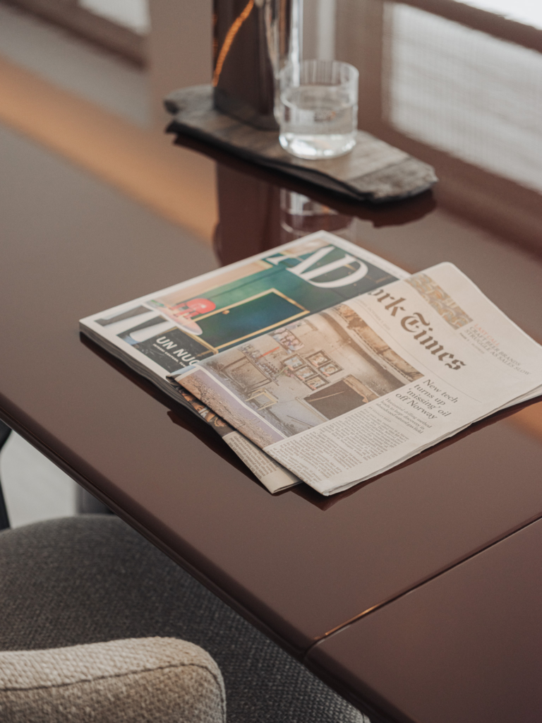 In the dining room, soft reflections play across the high-gloss, burgundy-coloured table. The photograph by Jeroen Hofman, the view and the light streaming in are reflected in the surface, giving the room an almost painterly depth.