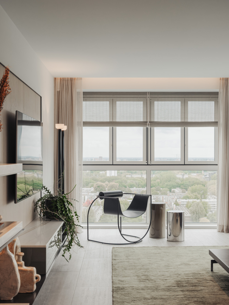 This fully renovated apartment is located in the heart of the dynamic business district, in one of the towers that form the skyline. The Zuidas has an international character, that was the starting point for our design.
