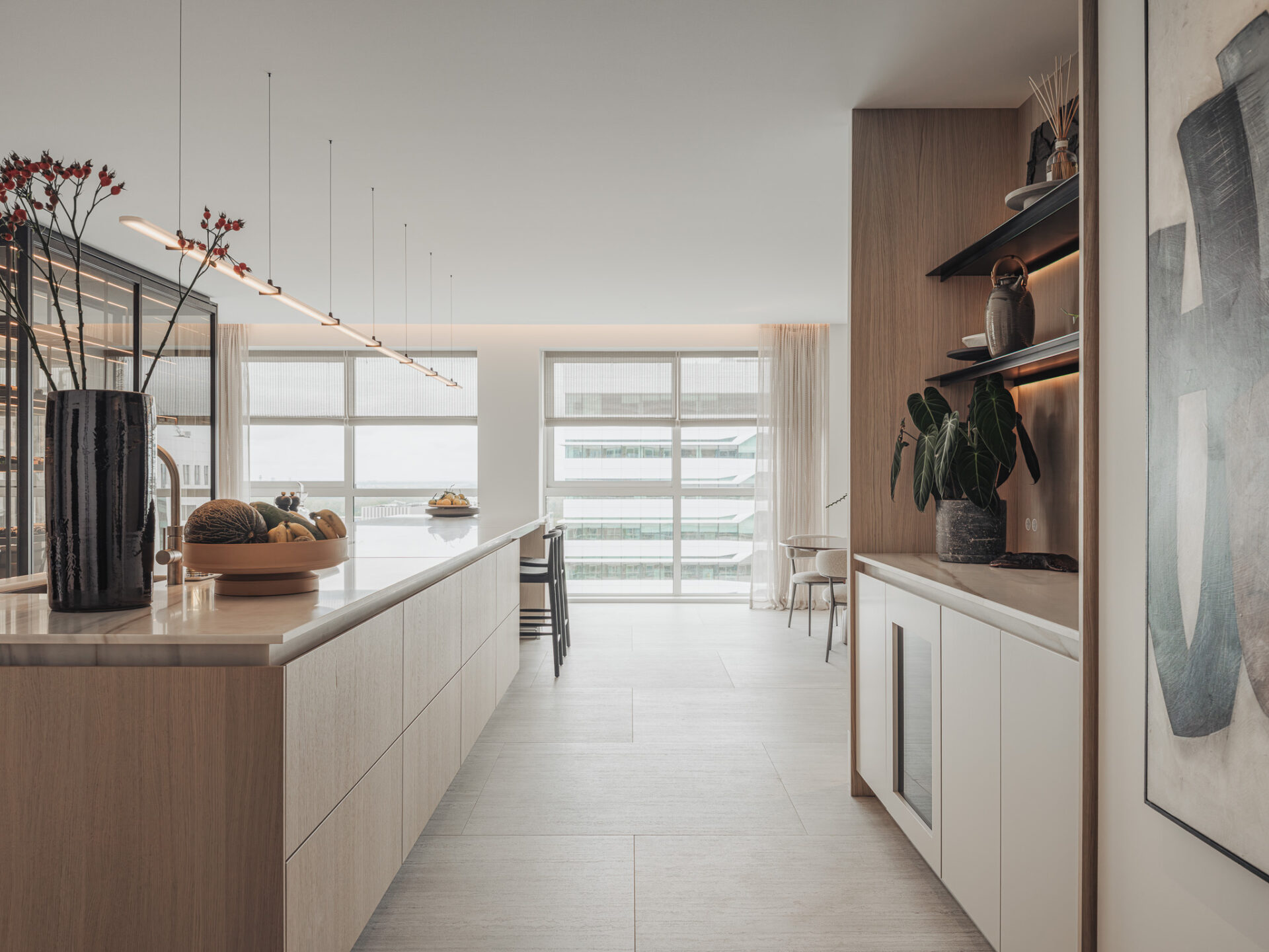 From the kitchen, you can experience the complete openness of the apartment thanks to the unobstructed view of the living room. The transparent wine cabinet subtly marks the transition between the two areas, a separation that also creates a connection.