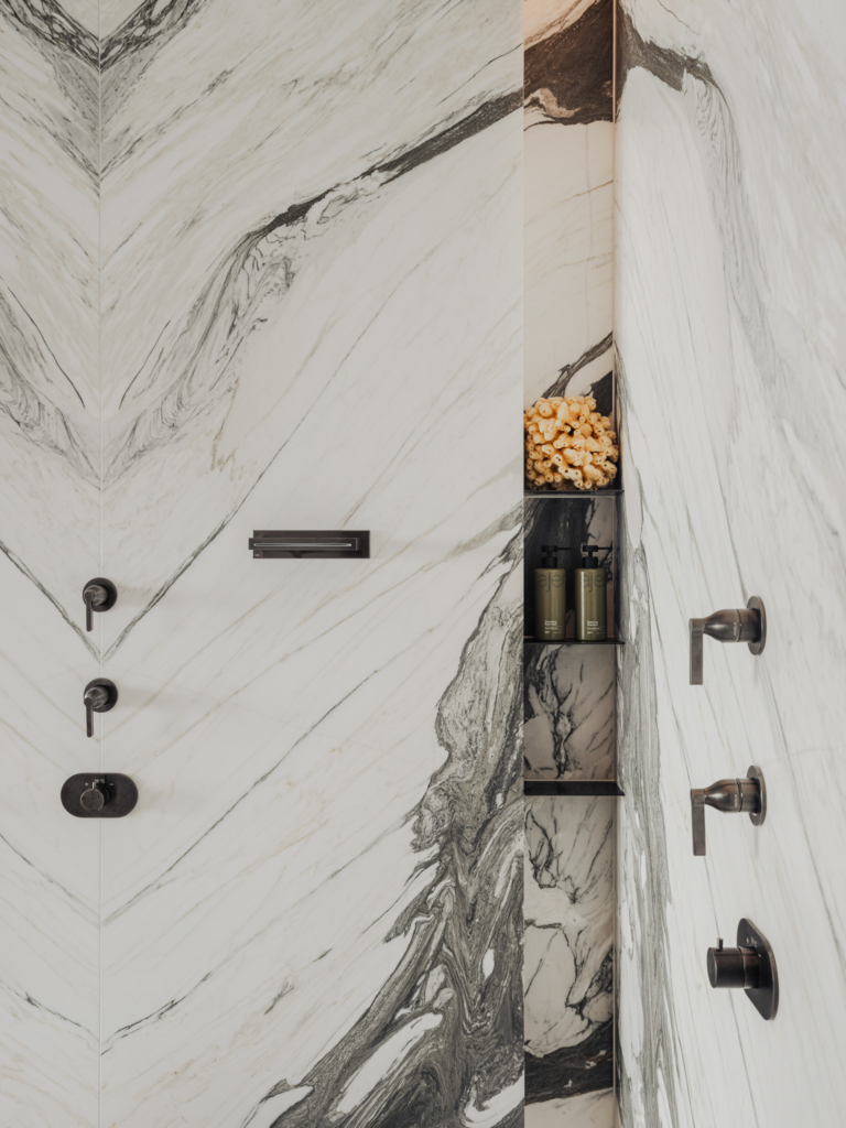 The shower is clad in generous natural stone slabs with a powerful, distinctive pattern, giving the space texture and a luxurious look.