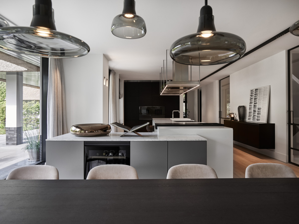 De routing in het huis is belangrijk. De belijning stelt de keuken als middelpunt. Alle overige ruimtes zijn hieromheen gebouwd.